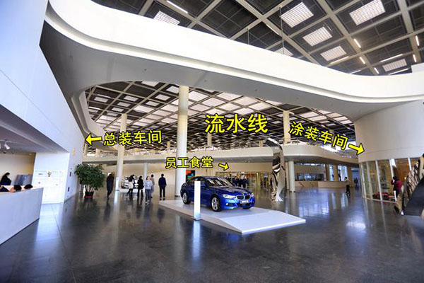 寶馬鐵西工廠設在MOB辦公大樓辦公區下面,頭上一條傳送帶,連接著涂裝車間和總裝車間,置身其中你甚至發現不到這道工序的的存在。因為它太安靜了太環保了,沒有機械的轟鳴也沒有油漆的異味,能將辦公區域與生產車間巧妙結合不得不說MOB辦公大樓的精巧之處。