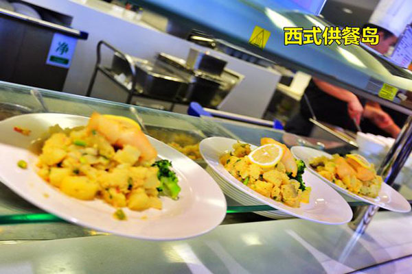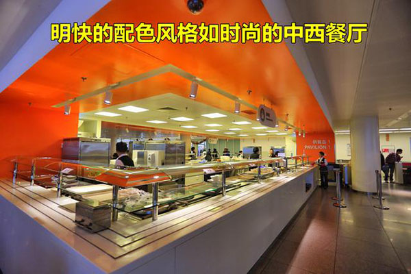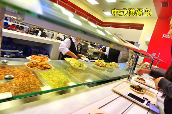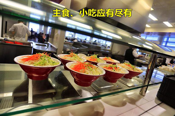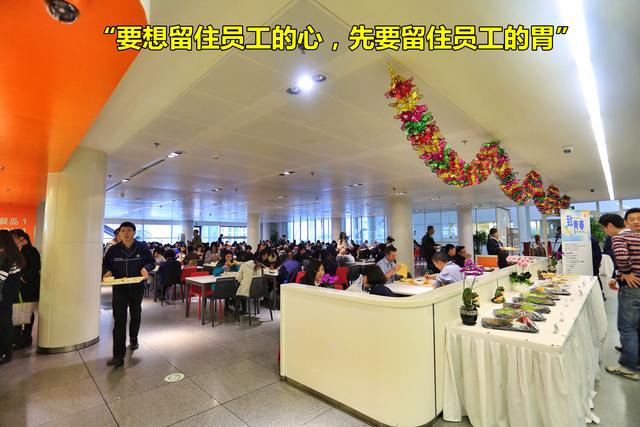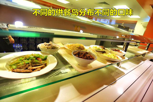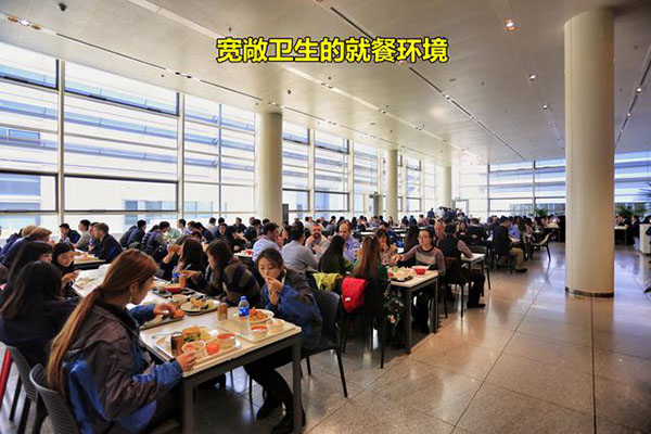 食堂全部是開放式布局,就餐時間是按每個車間分時段就餐。不說是單位食堂你會以為是一個經營有序的大型中西餐廳,食堂以獨立的供餐島分布不同的口味區,除了傳統的中西餐外還有面檔和麻辣燙,以及供應給穆斯林員工的回民餐飲區,也有供應給特殊員工的關愛餐區,非常人性化。