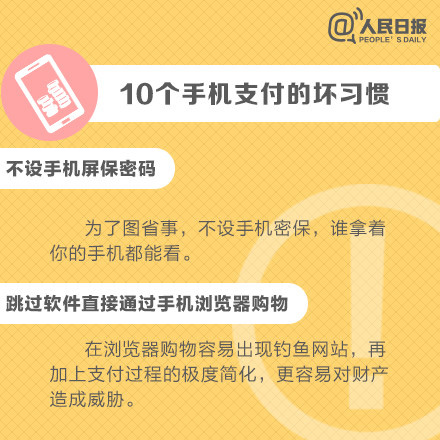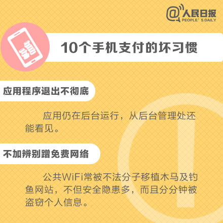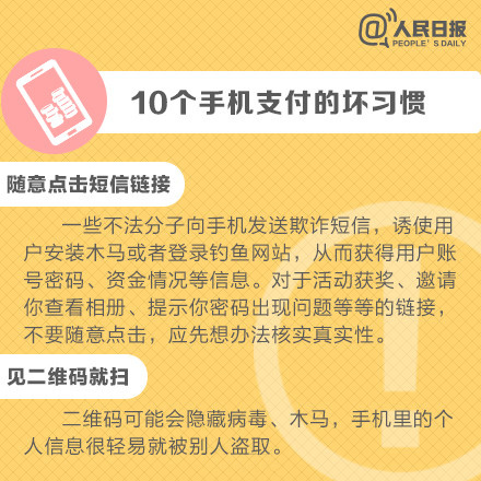 手機(jī)給人們生活、娛樂帶來方便的同時,也給我們帶來了安全隱患,使用手機(jī)時的一些"壞習(xí)慣"一定要改掉,保護(hù)好個人網(wǎng)絡(luò)賬戶安全,避免不必要的損失。