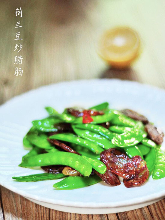 1.荷蘭豆洗凈去掉兩頭老絲;臘腸斜切片;青、紅尖椒切小段,去掉籽。