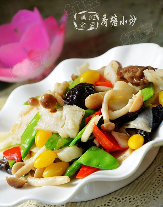 5.然后加入蓮藕,荸薺,蘑菇,荷蘭豆翻炒。