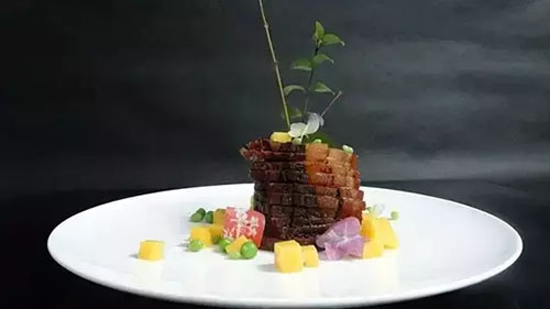 要求一款菜肴最多只能體現三種顏色,如果顏色太多,菜肴就會顯得非常零亂,檔次自然也不高。