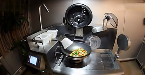 這是一款德國人發明的自動炒菜機。可以根據菜品設定程序!淋油、加菜、翻炒,還能顛勺……連刷鍋都是自動的……