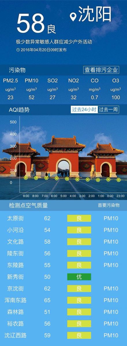 接下來共同關注沈陽未來幾天的具體天氣情況:今天天氣晴轉多云,西南風3-4級,空氣質量良好,白天最高氣溫為20℃左右;今天夜間風清月明,最低氣溫為8℃左右。