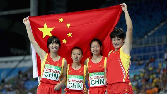 田徑女子T35-38級4x100米項目中,中國運動員蔣芬芬、陳君飛、李英粒、文曉燕為祖國奪得一枚金牌(50.81秒),并一舉刷新世界紀錄!