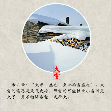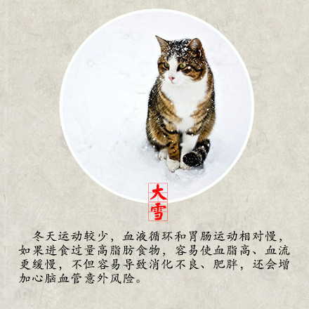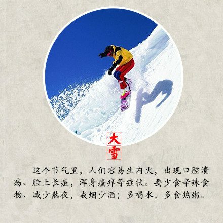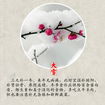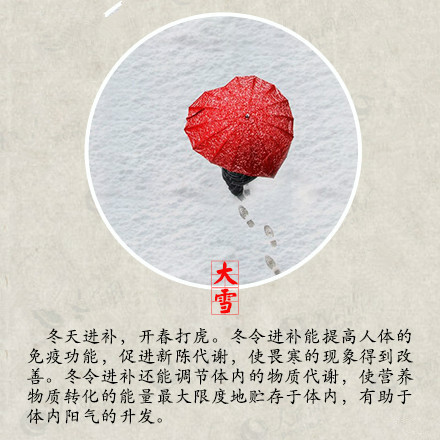 昨日本是大雪節氣,但是今日這場大雪才如約而至,你有沒有和雪來一場互動呢?堆個雪人,打個雪仗,在綿綿的雪地上留下自己的腳印,但是玩耍的同時大家不要忘記注意保暖哦! 大雪時節是身體進補的大好時節,大雪補養得當,來年就有很堅實的身體底子,抵抗疾病的侵擾。萬物生機潛藏,不宜擾動陽氣,鍛煉方面應動中求靜,保持心情沉靜愉悅,起居方面應早睡晚起,避免受寒,居室溫度宜保持在16~20℃,濕度宜保持30%~40%,濕度過低會造成咽喉干燥,引發上呼吸道疾病的發生。