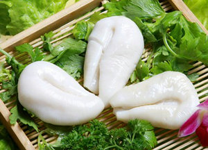 將烏魚蛋從罐頭內取出,將其一片片揭開,用清水沖洗兩遍。鍋內加入清水1500克,燒開后放入30克泡打粉、30克堿面調勻,下入烏魚蛋小火煮30分鐘倒出。按著這種方法反復操作三次,再用清水煮一次,即可使用,還可以用冷水浸泡,隨用隨取。烹調后,烏魚蛋沒有一絲腥味。