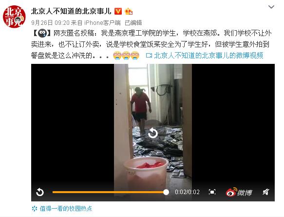 據河北燕京理工學院的學生爆料稱:"我們學校不讓外賣進來,也不讓訂外賣,說是學校食堂飯菜安全,為了學生好,但被學生意外拍到餐盤就是這么沖洗的。"
