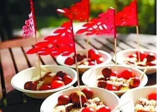 重陽糕又稱花糕、菊糕、五色糕。講究的重陽糕要做成九層,像座寶塔,上面還做成兩只小羊,以符合重陽(羊)之義。有的還在重陽糕上插一小紅紙旗,并點(diǎn)蠟燭燈。這大概是用"點(diǎn)燈"、"吃糕"代替"登高"的意思,用小紅紙旗代替茱萸。