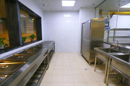 利用餐廳空間設置明檔,可以把涼菜間、烤烙間等移至明檔,既增加商業氛圍,又可以解決廚房面積緊張的問題。食堂在餐廳采用通透式售餐間和開放式洗碗間也可以減少廚房占用面。