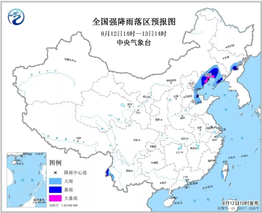 暴雨預報:預計,8月12日14時至13日14時,山東西北部、河北東部、天津、遼寧中南部、吉林東部等地有大雨或暴雨,其中,遼寧西南部的部分地區有大暴雨(100~200毫米)。上述地區最大小時降雨量20~40毫米。