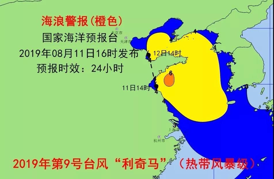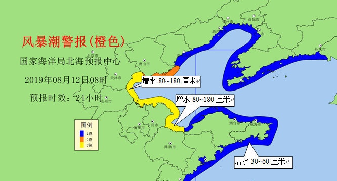 自然資源部北海預報中心官方微博發布風暴潮預警,受今年第9號臺風"利奇馬"(熱帶風暴級別)影響,預計8月12日上午到13日上午,山東半島沿岸將出現30-60cm的風暴增水,萊州灣和渤海灣沿岸將出現80-180cm的風暴增水。曹妃甸和京唐港驗潮站將出現達到當地橙色警戒潮位的高潮位。濰坊港、黃河海港、濱州港、黃驊和塘沽驗潮站將出現達到當地黃色警戒潮位的高潮位,蓬萊、龍口和秦皇島驗潮站將出現達到當地藍色警戒潮位的高潮位。河北省唐山市預警級別為橙色,山東省濰坊市、東營市和濱州市,河北省滄州市和天津市預警級別為黃色,山東省日照市、青島市、威海市和煙臺市,河北秦皇島市預警級別為藍色。