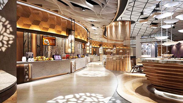美食廣場設計方案通常采取在大空間場地的周邊布置售賣柜臺和廚房,每家店鋪占用空間較小,店面寬為3-6米,進深為6-10米,每家店鋪需要配備排油煙設備及廚房后部運輸通道。隨著生活水平不斷提高,人們對食物口味的要求越來越高,因此食物的質(zhì)量是美食廣場每家店鋪競爭的關鍵,需要業(yè)主配備精良的廚房設備。