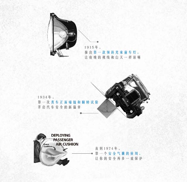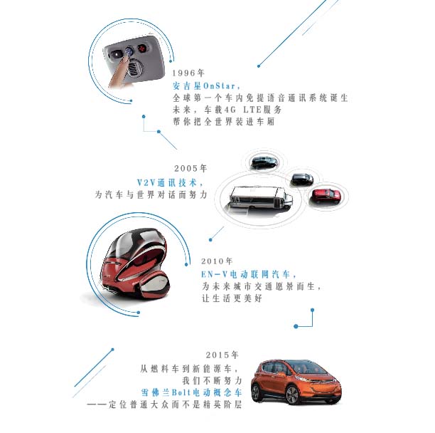 1996年全球第一個車內免提語音通訊系統誕生;2005年,V2V通訊技術,為汽車與世界對話而努力;2010年,EN-V電動聯網汽車,為未來城市交通遠景而生;2015年,從燃料車到新能源車,我們不斷努力。