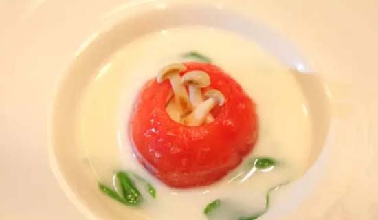 鮮魚汁十月紅 38元/位:意為"花好月圓",有著"金枝玉葉"美稱的白玉菇加上甜豆、面片、豆苗放入番茄中,番茄浸入魚湯,象征洞房春暖魚水情深。