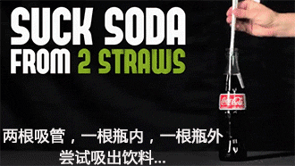 兩根吸管,一根瓶內,一根瓶外嘗試吸出飲料