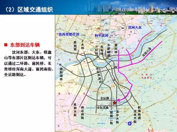 沈河東部、大東、棋盤山等東部片區到達車輛,可以通過二環路、富民橋、長青橋經渾南大道、富民南街、全運路到達。