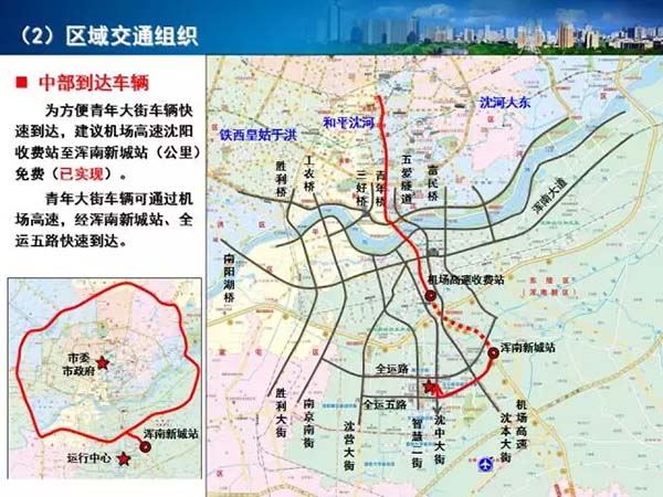為方便青年大街車輛快速到達,建議機場高速沈陽收費站至渾南新城站(公里)免費(已實現)。