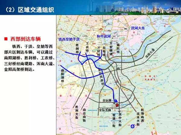 鐵西、于洪、皇姑等西部片區到達車輛,可以通過南陽湖橋、勝利橋、工農橋、三好橋經南堤路、渾南大道、金陽高架橋到達。