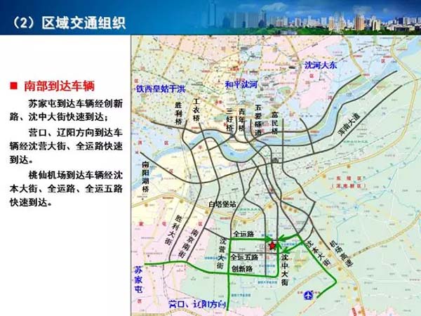 蘇家屯到達車輛經創新路、沈中大街快速到達;營口、遼陽方向到達車輛經沈營大街、全運路快速到達。桃仙機場到達車輛經沈本大街、全運路、全運五路快速到達。