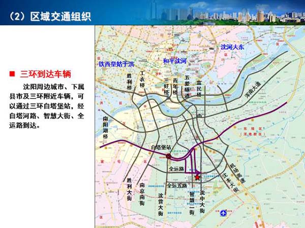 沈陽周邊城市、下屬縣市及三環附近車輛,可以通過三環白塔堡站,經白塔河路、智慧大街、全運路到達。