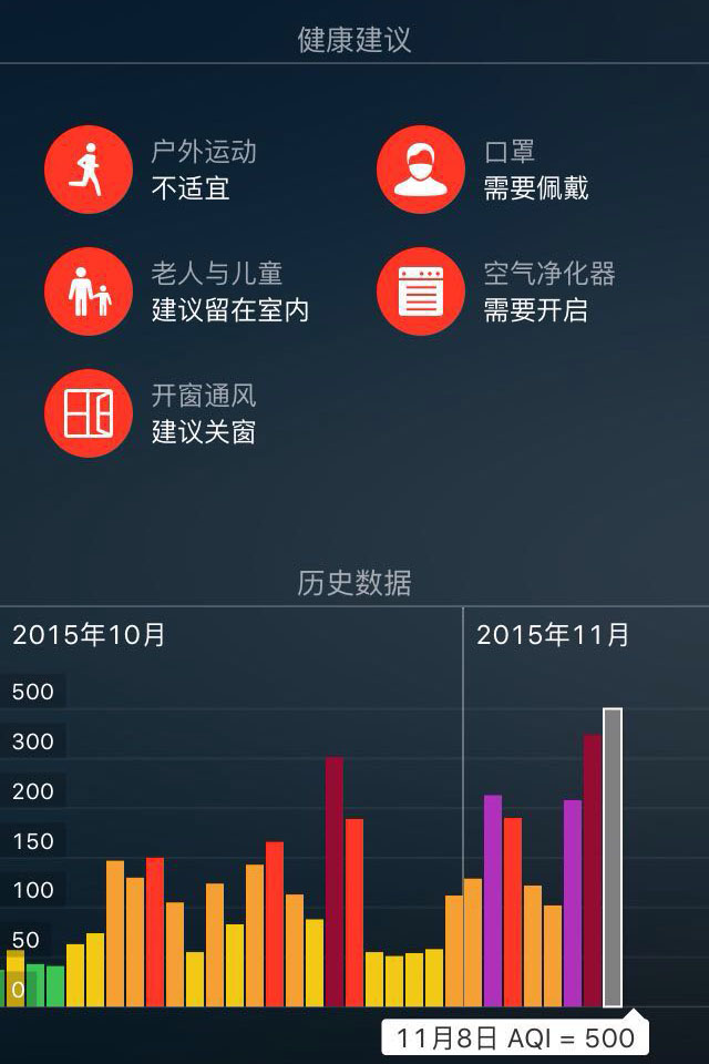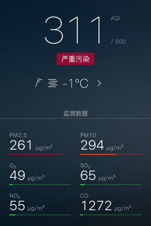 今日(周一)的空氣質量相對周日有所好轉,但依然是處于嚴重污染的狀態,近期外出,口罩成了必備品,老人和兒童留在室內是"安全"的選擇。建議室內養殖一些綠色植物,在不宜開窗換氣的天氣中,綠色植物可以改善室內空氣質量。