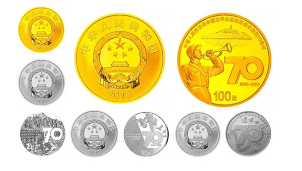 為紀念中國人民抗日戰爭暨世界反法西斯戰爭勝利70周年,中國人民銀行自2015年8月20日起陸續發行紀念幣一套,包括金銀紀念幣3枚、鎳包鋼紀念幣1枚,均為法定貨幣。金銀紀念幣由深圳國寶造幣有限公司、沈陽造幣有限公司和上海造幣有限公司三家鑄造。