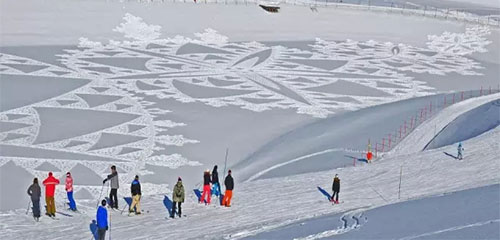 沒錯,別人用手在畫布上畫畫,他用腳在雪地上畫畫。