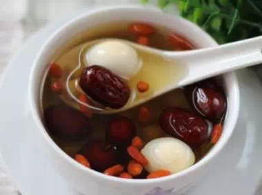 紅棗加桂圓煲紅糖水,到棗爛、桂圓綿時,打只雞蛋;繼續用小火焐熟雞蛋。紅棗、桂圓和紅糖都有補血的功效,煮出的雞蛋很滋補。