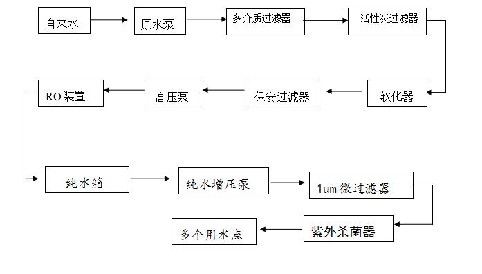 根據(jù)進水水質(zhì)及行業(yè)對系統(tǒng)產(chǎn)水指標(biāo)的要求,從系統(tǒng)出力、產(chǎn)品質(zhì)量、技術(shù)先進性、項目投資、運行成本、安全性和環(huán)保效益等方面考慮,依照提高系統(tǒng)性能價格比的原則,我們設(shè)計了工作流程如下: